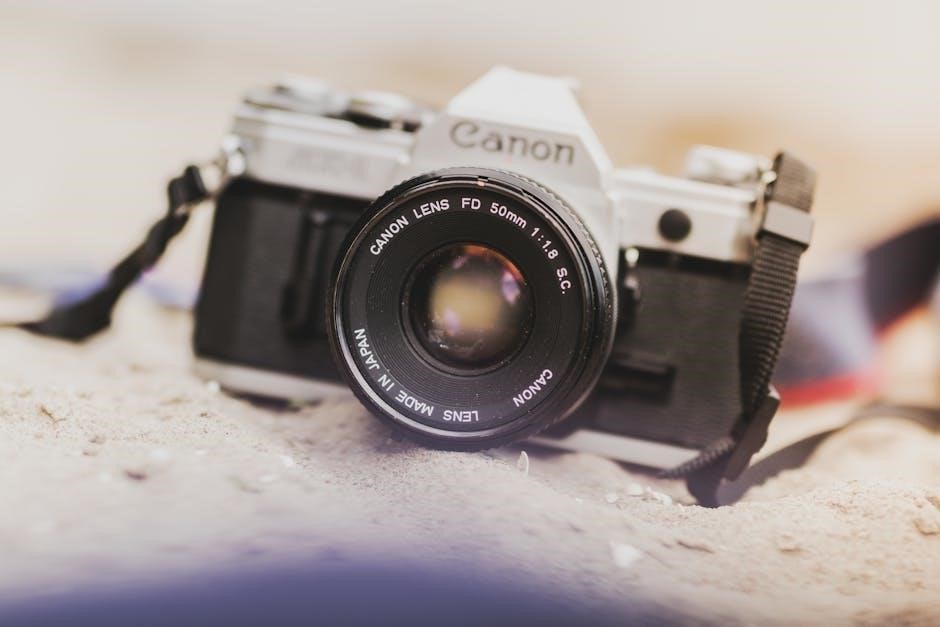 The Canon AE-1 Program requires careful 35mm film loading and rewinding, as detailed in available manuals from resources like the Internet Archive.